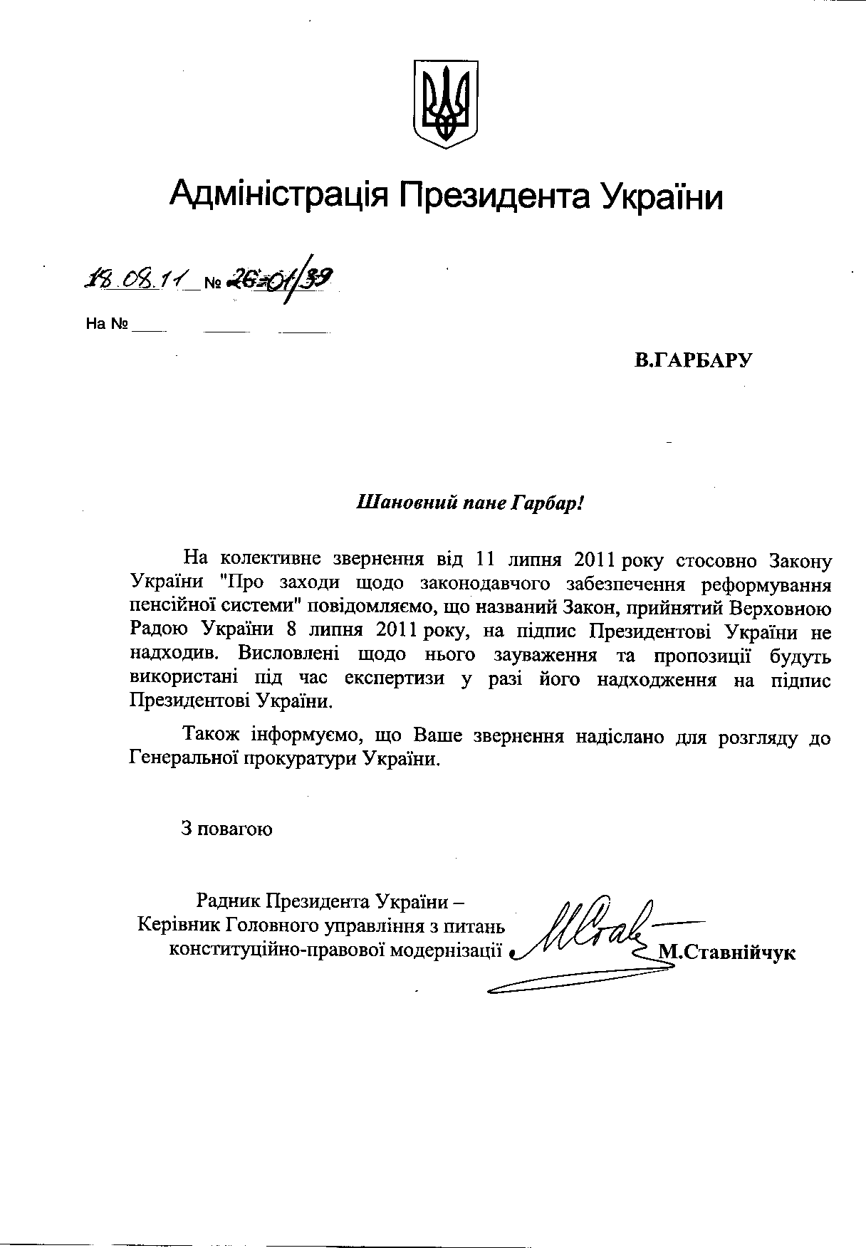 М.Ставнійчук пише, що пенсійна реформа президенту на підпис не надходила, а наше звернення буде використано для експертизи. І відсилає нас в ГПУ. Знову.