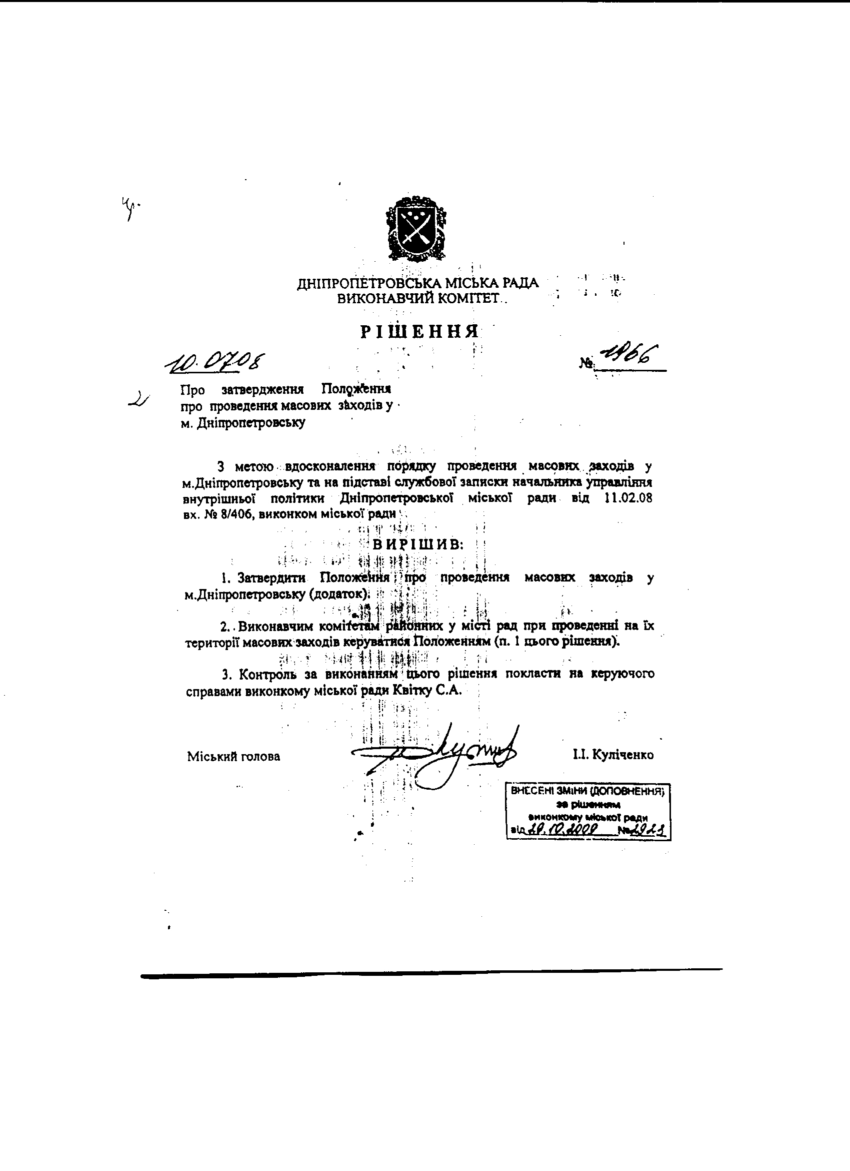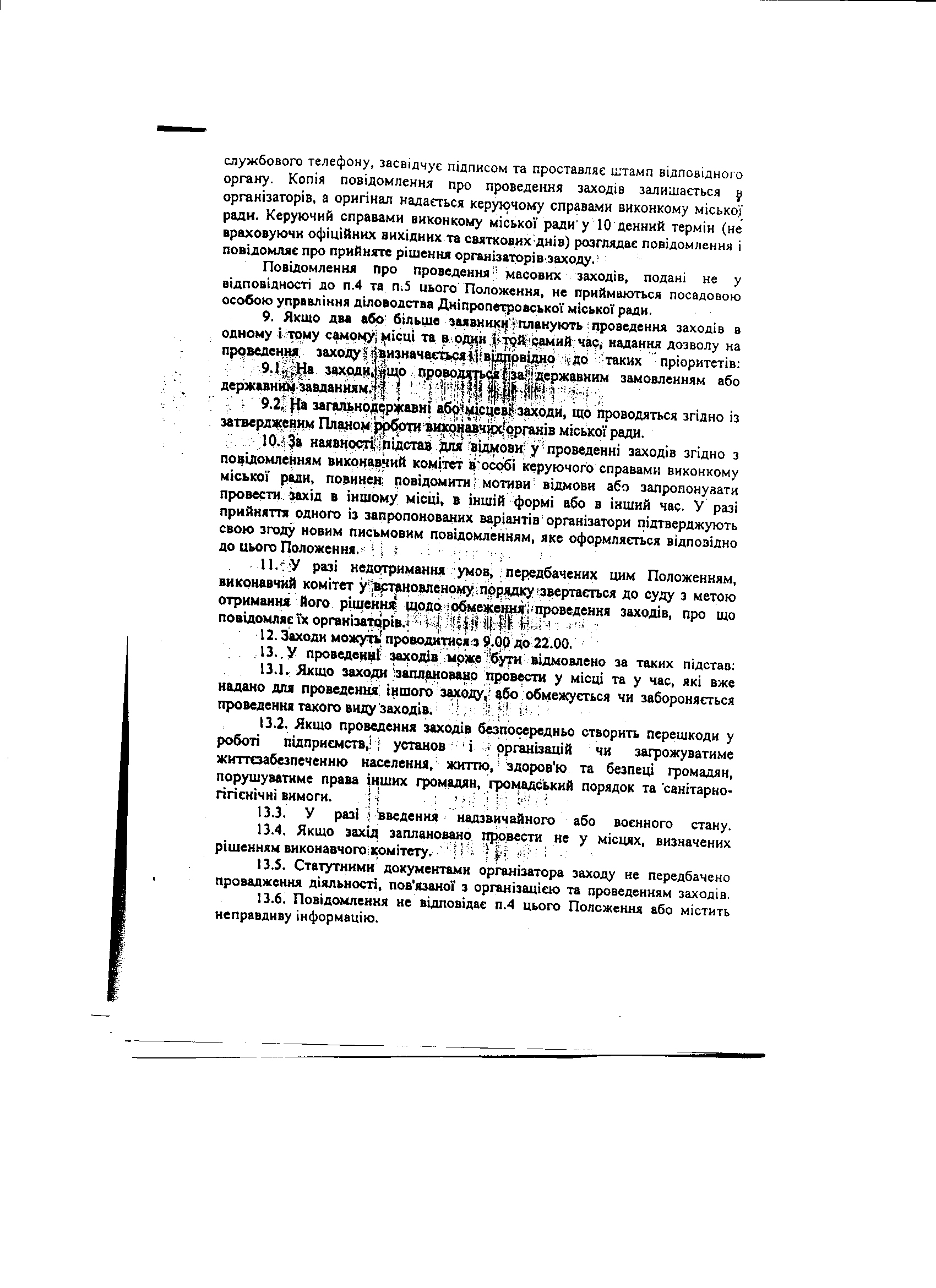 1. Чи існує затверджений міською радою порядок розгляду повідомлень громадян, громадських організацій, політичних партій про проведення мирних зборів, мітингів, демонстрацій та інших масових заходів (ст.39 Конституції України)? Якщо так – надати копію такого акту. Якщо ні – надати інформацію, чим конкретно (якими правилами і критеріями) керується міська влада при визначенні наявности підстав для звернення до суду щодо обмеження права на мирні збори.