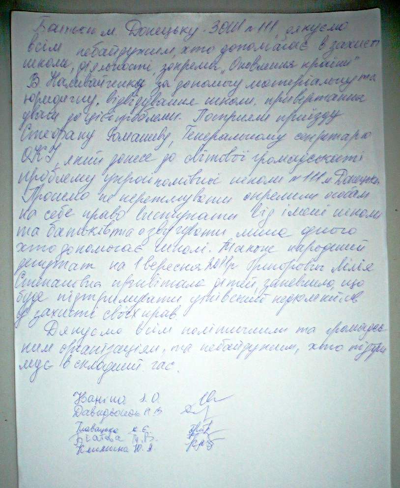 5) Спростування інформації викладеної на сайті Майдан від батьків, завуча та вчителів Донецької ЗОШ № 111.