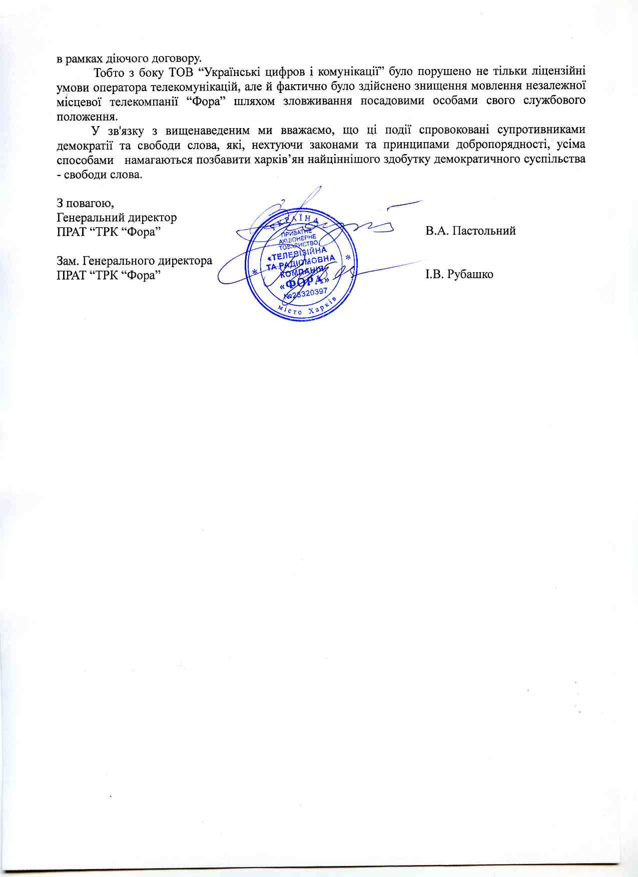 Відкритий лист Президенту України від телекомпанії “Фора” м.Харків 20-09-2011 21:17 Віктор Гарбар Language switcher Français FR Українська UK Deutsch DE Español ES Dansk DA Харківщина