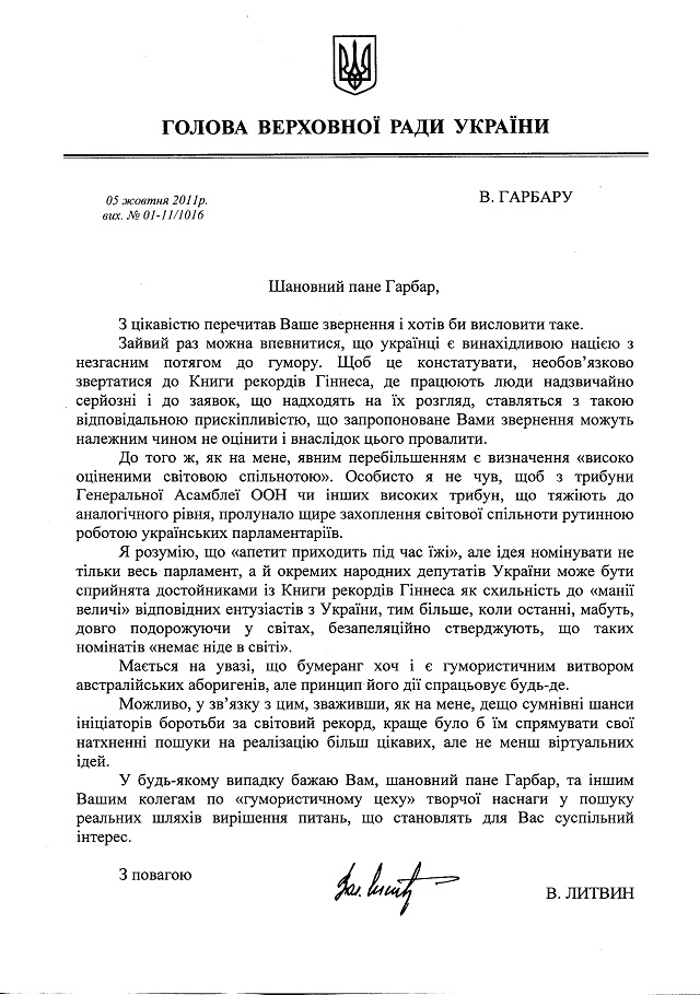 Ця відповідь приємно вразила нас тим, що традиції доброго гумору, притаманного попередникам пана Литвина на високій посаді Голови Верховної Ради України збережені і творчо розвинені. Приємно вразила скромність пана Голови, який побоюється, що підтримавши нашу ініціативу, буде звинувачений у нескромності, а навіть і у проявах манії величі. Одначе згадка про високу трибуну Ґенеральної Асамблеї ООН показова. Мабуть і дійсно треба, аби про скромних українських парламентських піаністів згадали б (незлим, тихим словом) і з тієї високої трибуни. Опісля цього можна й до Книги рекордів Ґіннеса. Тоді буде скромно.
