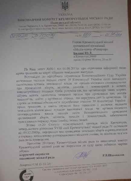 Ще два місяці тому кременчуцька мерія мислила так само. У серпні цього року, відповідаючи на інформаційний запит громадської організації Медіа-центр “Репортер” про регламентацію проведення мирних зібрань керуючий справами міськвиконкому Кременчука Руслан Шаповалов посилався не на документи колишнього СРСР, а на рішення Конституційного суду України.