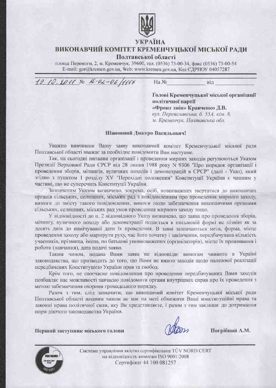 Д.Кравченко надав «Програмі плюс» копію листа першого заступника міського голови Кременчука Андрія Погрібного, в якому той пише, цитуємо: «На сьогодні питання організації і проведення мирних заходів регулюється Указом Президії Верховної Ради СРСР від 28 липня 1988 року №9306 «Про порядок організації і проведення зборів, мітингів, вуличних походів і демонстрацій в СРСР»». Далі йде стисле викладення указу, який передбачав, що про проведення мітингів та демонстрацій владу колишньої радянської держави слід було попереджати за 10 днів, вказувати точний маршрут руху демонстрації тощо.