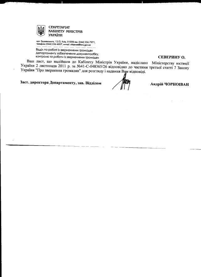 Азаров поки не відповів нічого і навряд чи вже щось відповість, адже звернення, як ви можете побачити на відсканованому повідомлені від чиновника Секретаріату КМУ, було щасливо відфутболено у бік…Міністерства юстиції України, котре не до чого, адже: