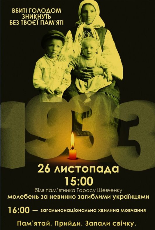 У суботу, 26 листопада, у День пам’яті жертв Голодомору львів’яни вшанують невинно загиблих у 1932-1933 рр. українців. Вшанування пам’яті розпочнеться із жалобного екуменічного молебня о 15.00 біля пам’ятника Т. Шевченку.