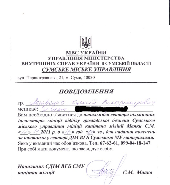 16-го листопада в Сумах додому до активіста “Чорного комітету” Олексія Лазаренка приїхали працівники міліції в цивільному. Варто зауважити, що Олексію наразі лише 15 років, тобто він ще є неповнолітнім, і тому не має права давати показання. Незважаючи на це, йому вручили повістку аби він прийшов до місцевого відділку міліції для дачі “показів”. Також викликали його брата Олександра, який взагалі наразі проживає в Києві.