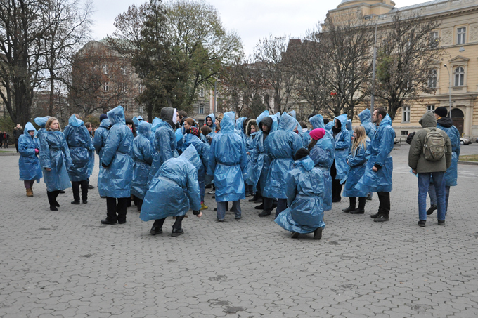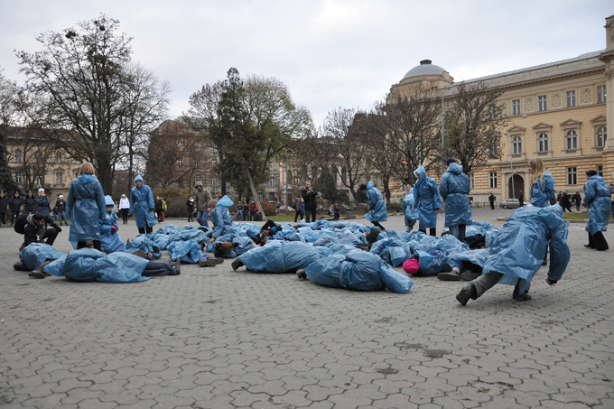 Близько ста учасників акції хаотично ходили по площі та під бій хронометра кожні 10 секунд по черзі падали на землю. У такий символічний спосіб львів’яни спробували передати всю глибину трагедії Голодомору. Згідно з даними істориків, у пік Голодомору за одну хвилину помирало 17 – 25 людей.