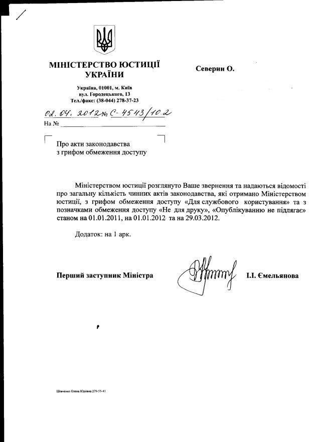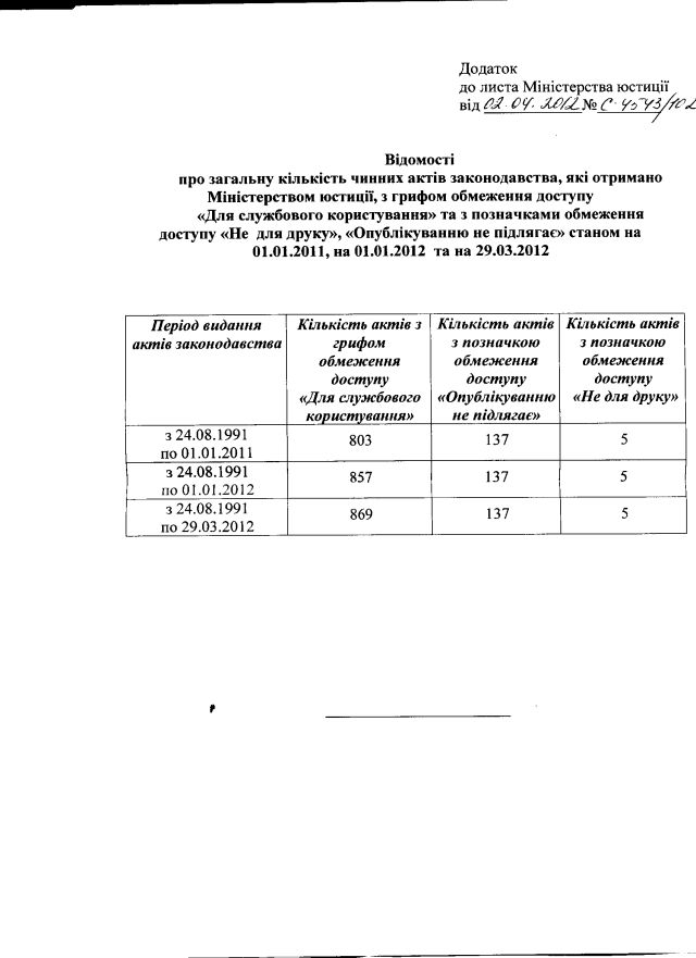 Ми спитали у Міністерства юстиції України про кількість чинних правових актів, котрі мають гриф обмеження доступу “Для службового користування” та позначки “Опублікуванню не підлягає” і “не для друку”. І якщо перший гриф став “в законі” з прийняттям нового інформаційного законодавства (котре деякі чомусь вважають “успіхом громадянського суспільства”), то дві інші позначки як завжди були так і дотепер залишилися поза законом, адже їх застосування не передбачено ні жодним законом ні взагалі хоча б будь-яким підзаконним нормативно-правовим актом. Що в них – суспільству невідомо. Відтак – їхне існування і застосування є абсолютно незаконною сваволею.