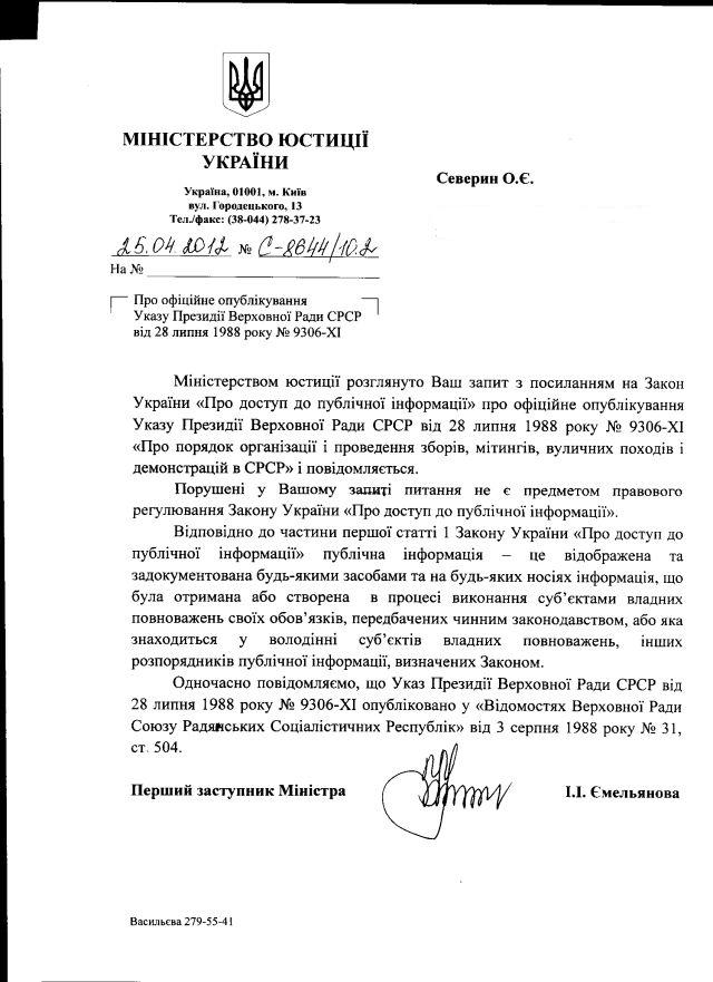1. Для вирішення певних питань нам знадобилося знати про факт і дату офіційного опублікування Указу “Президії Верховної Ради” СРСР від 28.07.98 №9306-ХІ “Про порядок організації і проведення зборів, мітингів, вуличних походів і демонстрацій в СРСР”.