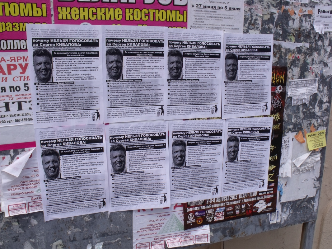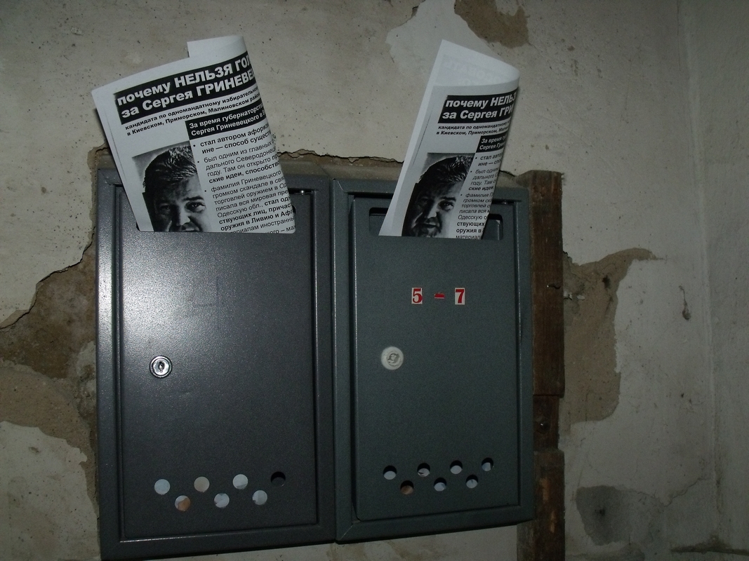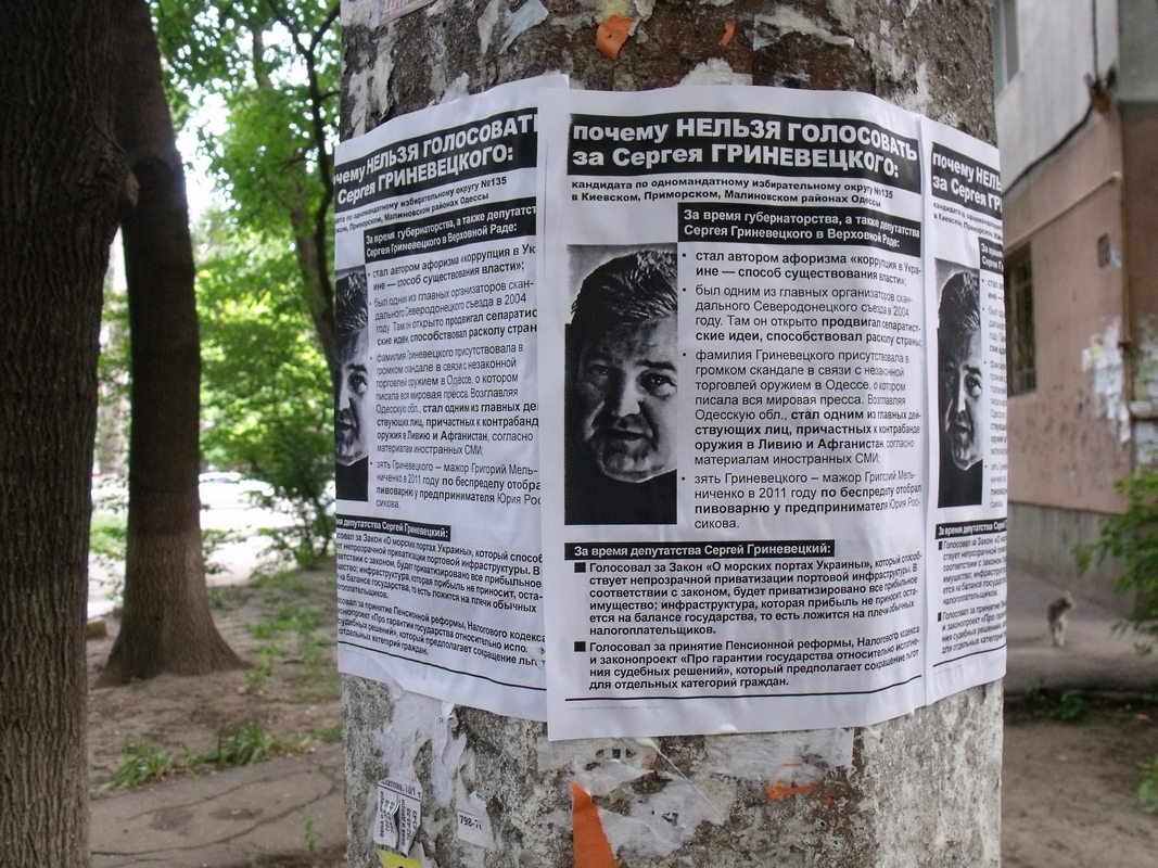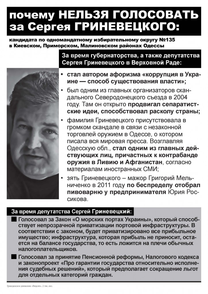 В Одесі збирається балотуватись також інший депутат з числа тих, хто проголосував за законопроект КаКа — Сергій Гриневецький з Народноъ партыъ Литвина. Цей персонаж відомий своїми сеператистськими закликами, незаконною торгівлею зброэю та ін. Листівки з інформацією, чому не варто голосувати за Гриневецького, розповсюдили в Київському та Малиновському районах Одеси.