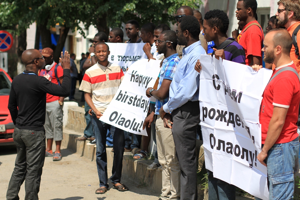 40 представників нігерійської громади і близько десятка громадських активістів з Луганська та Києва прийшли під стіни СІЗО, щоб привітати з днем народження Олаолу Сункамі Фемі – студента з Нігерії, який вже 7 місяців перебуває під вартою за звинуваченням у злочині, якого він не скоював.