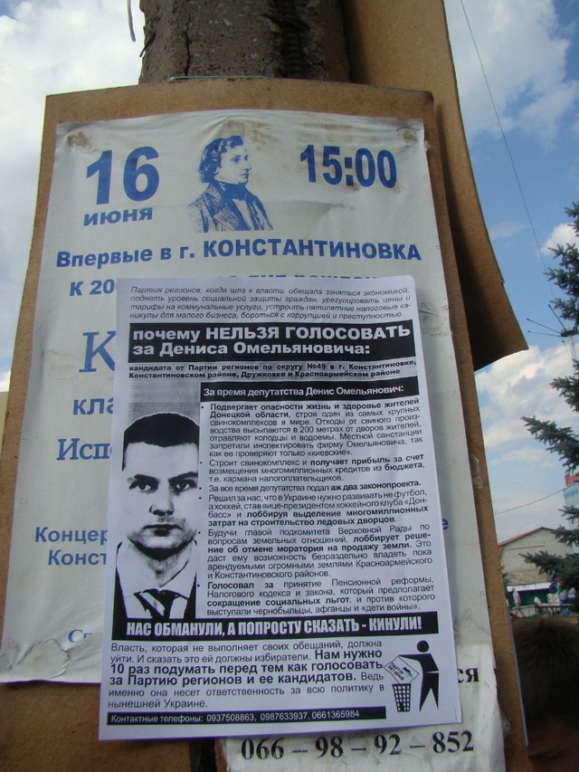 Кампания “Месть за раскол страны” дошла до Константиновки и Дружковки Донецкой области. Здесь в округе № 49 намеревается баллотироваться на выборах член фракции Партии регионов в Верховной Раде Украины Денис Омельянович, голосовавший за законопроект Кивалова-Колесниченко “Об основах государственной языковой политики”. Местные активисты кампании распространили в этих двух городах листовки с нелицеприятными фактами из жизни и биографии народного депутата с призывом к избирателям не отдавать ему свои голоса.