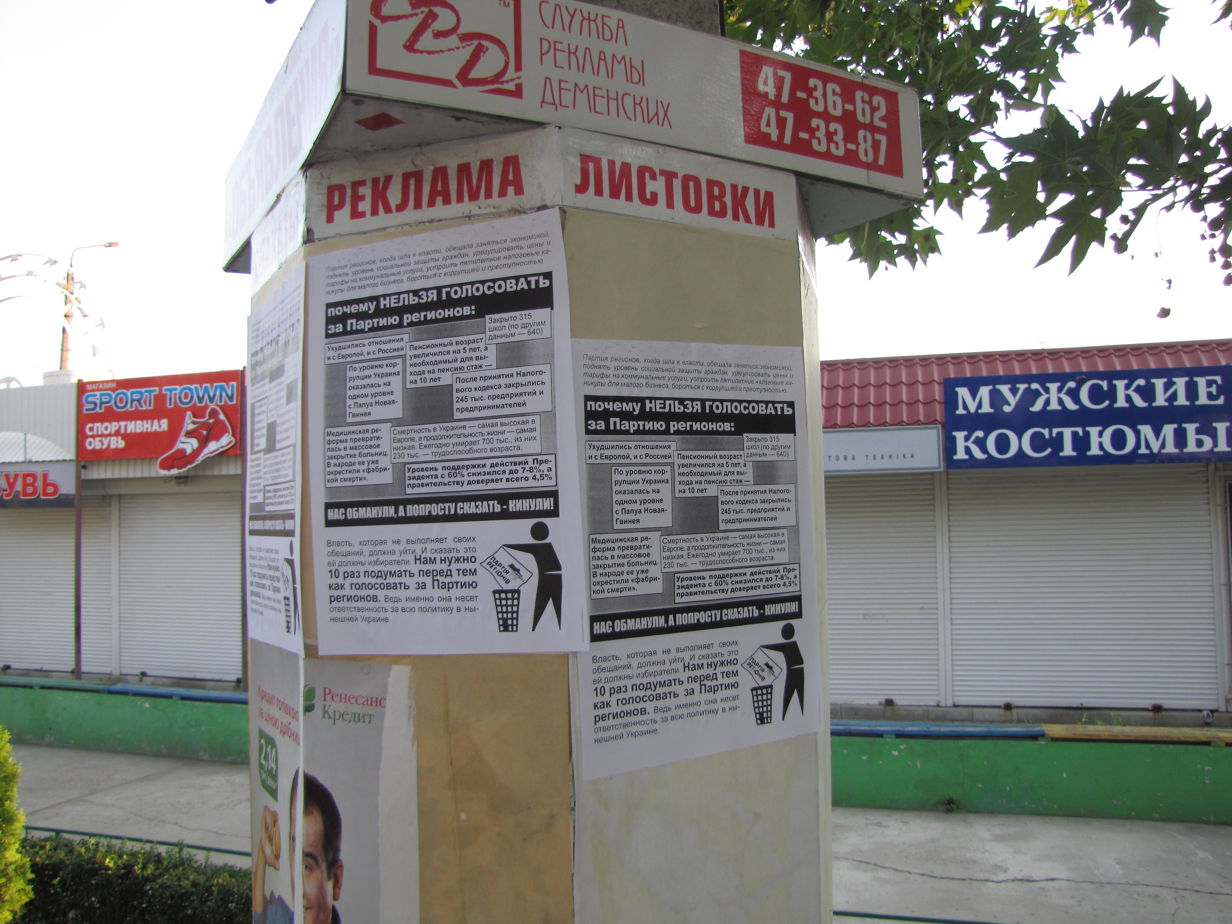 Активісти Громадянського руху “Відсіч” та місцевих громадських організацій у вихідні дні розклеїли по місту та роздали людям російськомовні листівки із закликом не голосувати за Партію регіонів та її кандидатів на мажоритарних округах на парламентських виборах.