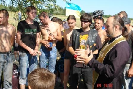 Мы насчитали около 50 велосипедистов, половина которых была из Дружковки, а вторая — примерно поровну делилась между Константиновкой и Краматорском (впервые прибывшим таким составом). А кроме них (и тоже впервые) участвовало 25 байкеров из Дружковки и Краматорска. Причем один из заядлых байкеров, священник Свято-Вознесенской церкви КП о.Игорь, приехав на мотоцикле, облачился затем в ризу и отслужил напутственный молебен.