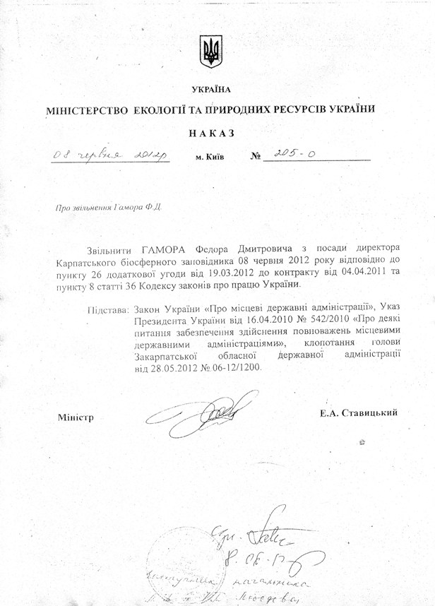 Все змінилось з призначенням у кінці квітня нового міністра: двох останніх протоколів на сайті Міністерства вже немає. Річ в тім, що на засіданні у червні розглядалось питання звільнення з посади директора Карпатського біосферного заповідника, Федора Гамора (див. додані файли). Подання на звільнення було ініційоване Рахівською районною та Закарпатською обласною владою. Основною причиною, напевно, є намагання Федора Дмитровича виконати указ Президента України про розширення території Карпатського біосферного заповідника. Схоже, що розширення заповідника не на руку силам, які займаються експлуатацією Карпатських лісів. А керівництво Мінприроди замість охорони природи стало підтримувати чиїсь бізнес-інтереси. Після цього засідання протоколи ГР на сайті міністерства перестали з’являтись, а на листи голови Громадської ради Міністерство перестало відповідати, тому наразі ГР не має документального підтвердження або спростування наказу про звільнення Гамора Ф. Д.
