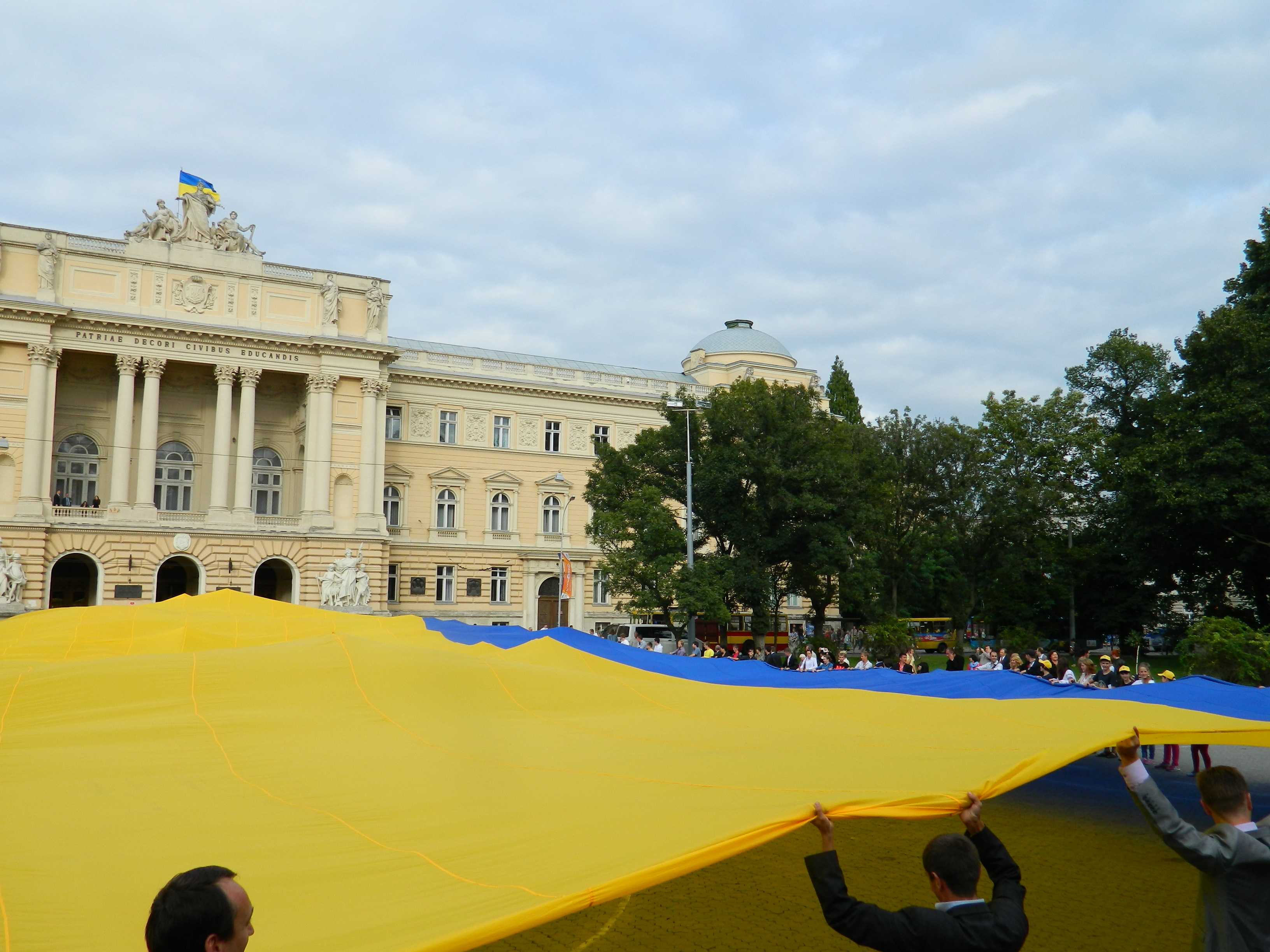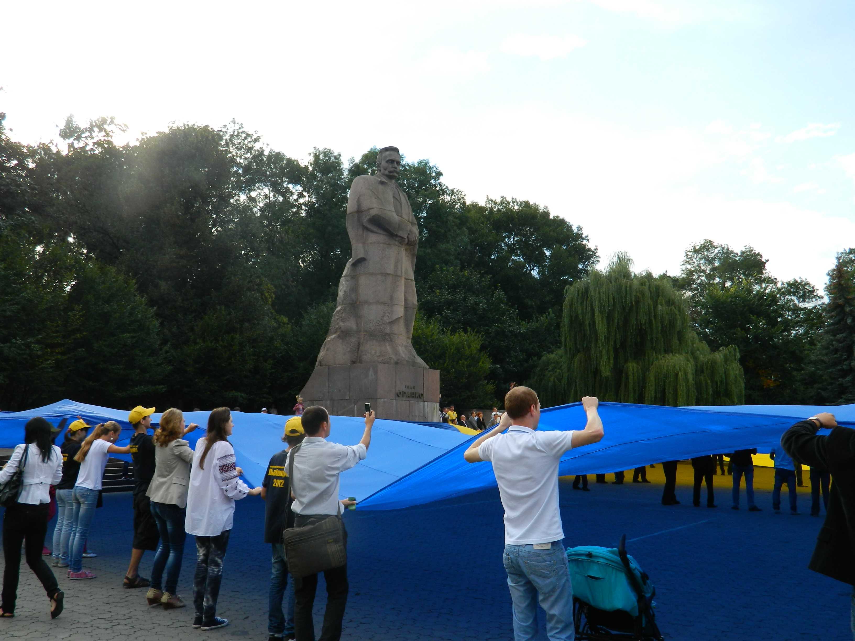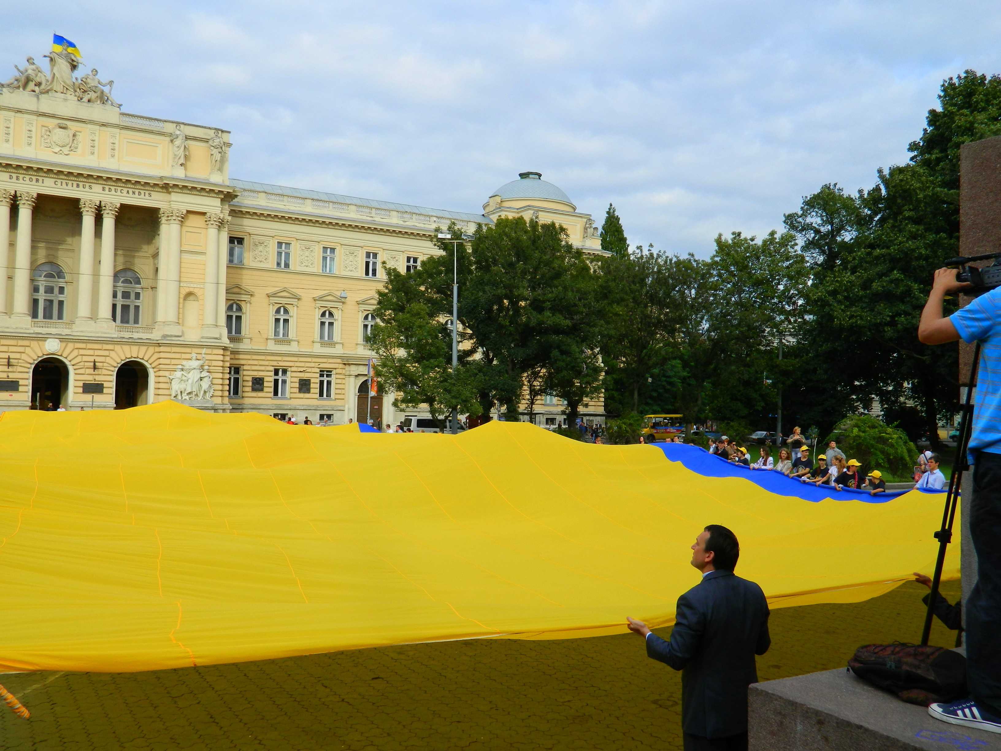 27 серпня у Львові, о 17-30 молодь розгорнула найбільший український прапор, який був спеціально виготовлений до 21-ї річниці незалежності України! Прапор вперше розгорнули у Києві 24 серпня, чим встановили Рекорд України. Розміри прапору 40х60 метрів, площа його складає 2000 м. Прапор розгортали на площі перед Львівським НУ та пам’ятником Івану Франку. В події взяли участь близько 200 чоловік.Багато молоді було у вишиванках.
