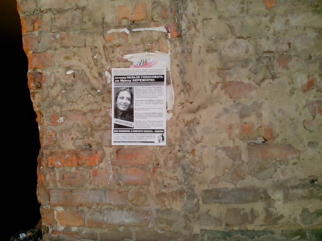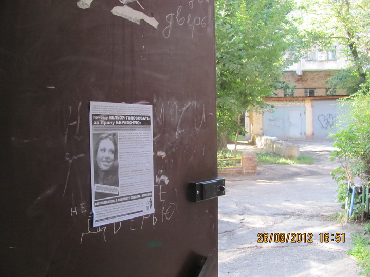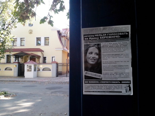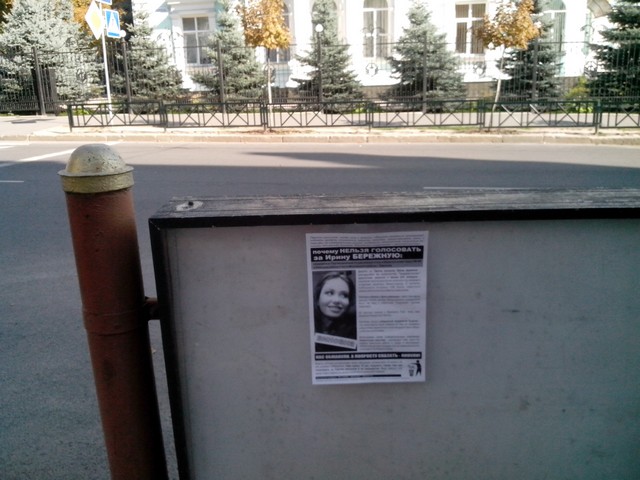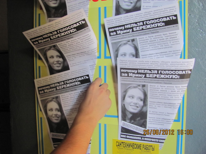 В Харкові продовжується “помста за розкол країни” Партії регіонів та її кандидатам в одномандатних мажоритарних округах. Активісти кампанії вже поширювали в місті інформаційні листівки з закликом не голосувати за кандидата від Партії регіонів в окрузі № 168 – чинного народного депутата Валерія Писаренка.  Наступними об’єктам “помсти” стала народ депутат Ірина Бережна.