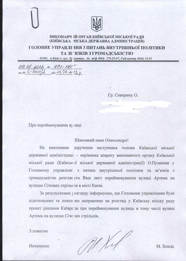 На фото вгорі (при клацанні збільшується) – Січові Стрільці. На скані внизу – чергова відповідь з КМДА.