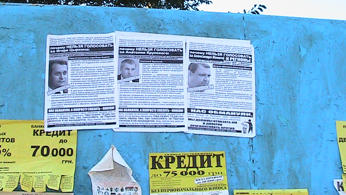 На минулому тижні кампанія “Помста за розкол країни” пройшла у Дніпропетровську проти Партії регіонів та низки кандидатів-мажоритарників. Місцеві волонтери виготували, окрім загальноукраїниських, власними силами й свої листівки проти Партії регіонів, Компартії та “Україна Вперед” (член її правління Сергій Харовський голосував у першому читанні за законопроект Ківалова-Колесніченка “Про засади державної мовної політики”), а також проти кандидатів від Партії регіонів Євгена Морозенка та Анатолія Крупського.