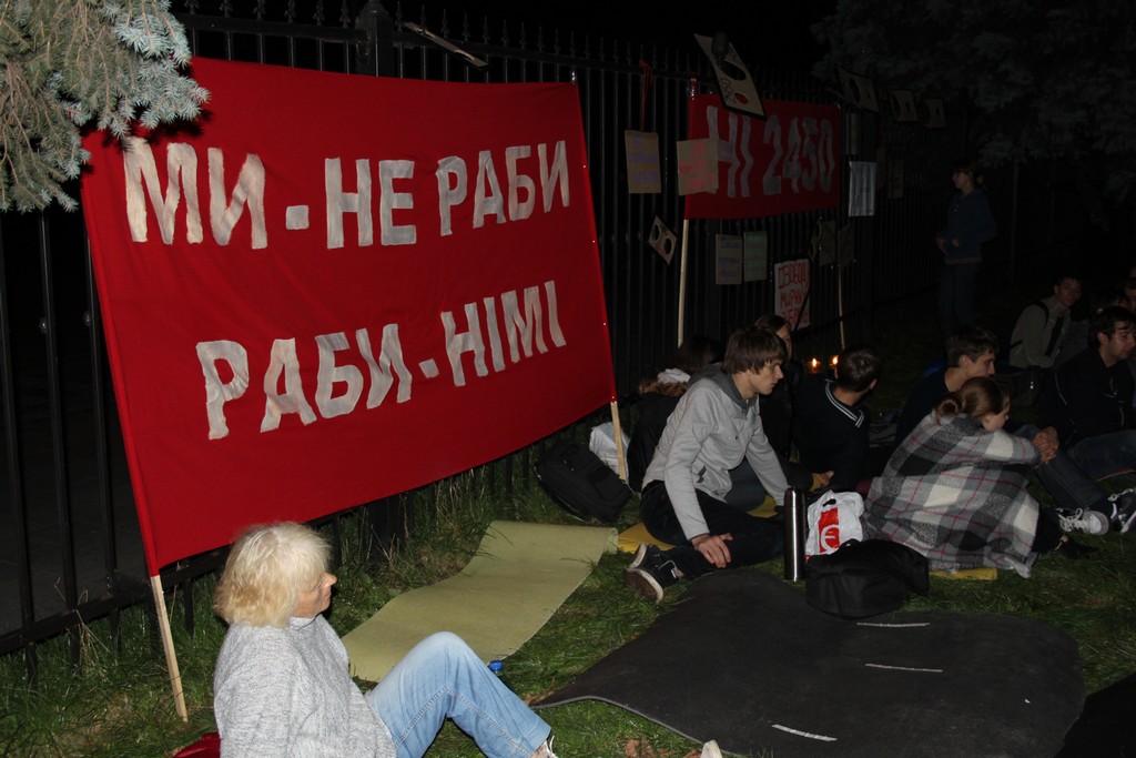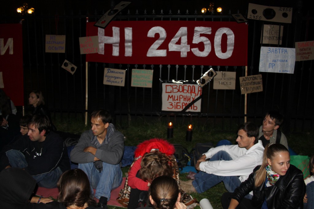 Не сплять і міліціонери, які вишикувались по всьому периметру паркану біля Верховної Ради. А сам паркан протестувальники обвішали гаслами “НІ 2450”, “Ми – не раби, раби – німі”, а також гаслами з різноманітних минулих протестів, в т.ч. і тих, які не стосуються політики: “Ні деградації освіти”, “Ні податковому тиску”, “Допоможіть безпритульним тваринам” і т. ін.