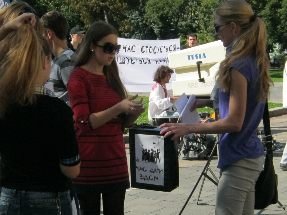 Жива музика, виконання відомих українських пісень змінювалось вуличним опитуванням, де всім присутнім пропонувалось дати відповідь на питання: «На що я готовий заради України?» і варіанти відповіді від песимістичного «При першій нагоді емігрую з цієї країни, Україна мені нічого не дала», за яку таки проголосувало кілька студентів, — до готовності «Системно працювати, віддавати частину свого часу, зусиль та грошей для благородної справи» та «Якби знав, що робити, зробив би все можливе». Тим, хто обирав ці варіанти відповіді, пропонували заповнити анкети і долучитися до роботи проти шкідливої діяльності сучасної влади, зокрема долучитися до кампанії «Помста за розкол країни».