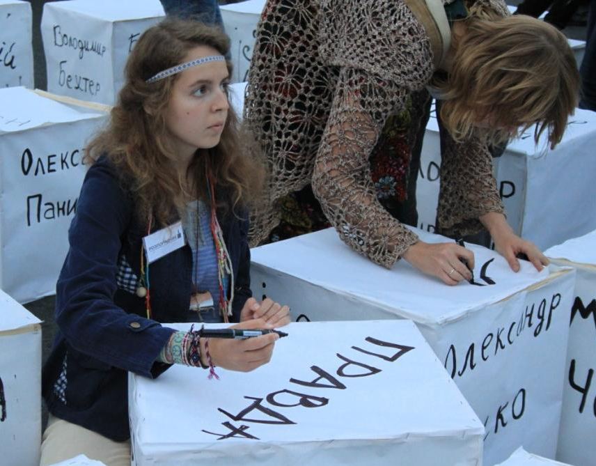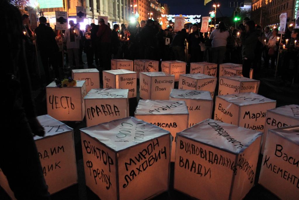 О 19.30 учасники вшанування виклали підсвіченими кубами напис ГІЯ. На самих кубах були написані імена загиблих журналістів, а також такі загиблі в душах можновладців речі як “Совість”, “Честь”, “Правда”, “Справедливість” та ін. Були куби і з написами “Свобода слова” та “Україна”.