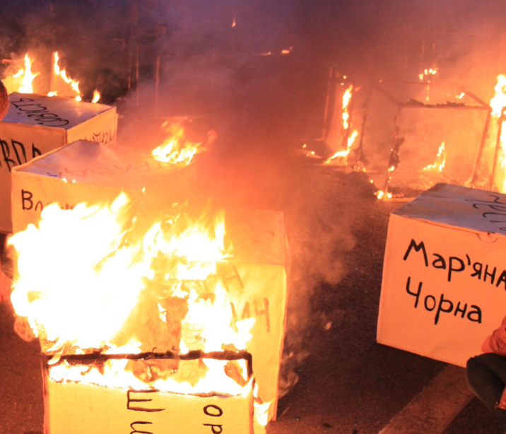 Під час промови невидимого для присутніх ведучого, учасники акції запалили куби, утворивши таким чином згарище свободи слова. На згарище поклали червоні троянди, а також спалили у ньому планшети з портретами Л. Кучми, В. Литвина та Л. Деркача й написами “Він повинен сидіти за ґратами” на них.