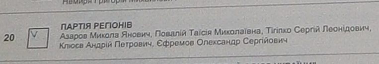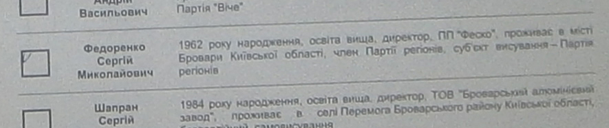 Аналогічно партійним спискам у випадку мажоритарників голоси, віддані шляхом малювання галочки у верхньому лівому куточку квадратика, підтримали тільки одного кандидата – висуванця партії регіонів Сергія Федоренка. Голосів таких знайшлося 20 штук.