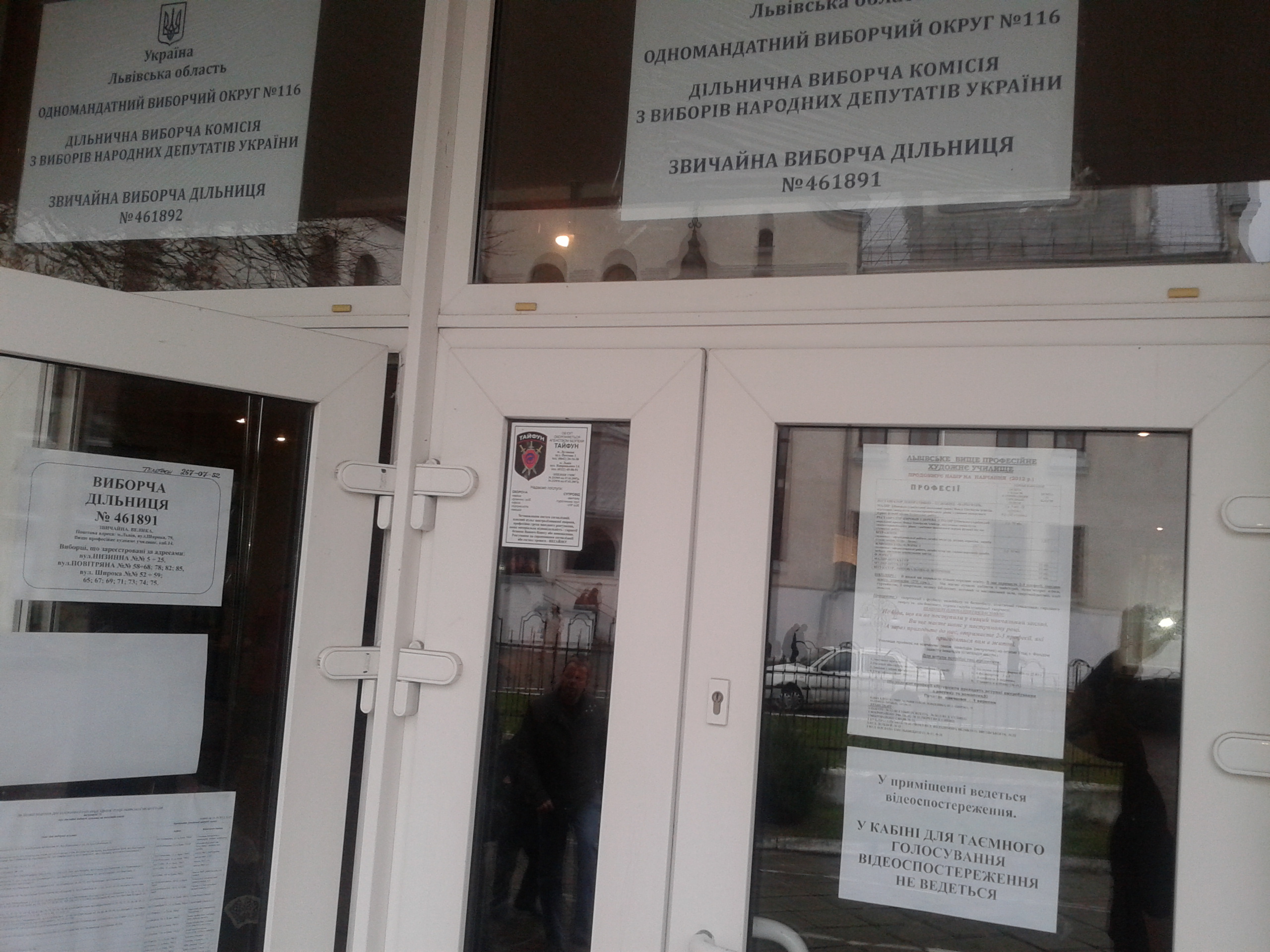 Округ №116, дільниця №461891. Дотримання порядку інформування про відеоспостереження. 28-10-2012 12:30 Віктор Гарбар Language switcher Français FR Українська UK Deutsch DE Español ES Dansk DA На дільницях присутня інформація про те, що відеоспостереження у кабінках для голосування не ведеться. Вибори2012Львівщина