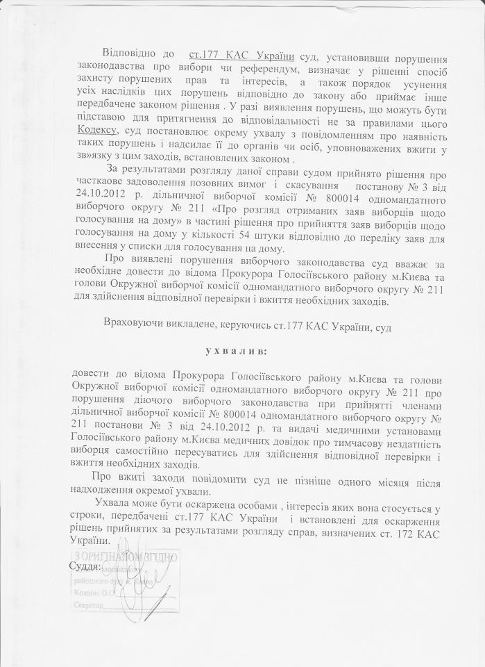 Голосіївський  районний суд міста Києва  сьогодні прийняв рішення про протиправність дій членів дільничої виборчої комісії, які своїм рішенням узаконили голосування на дому 54-м заявникам на основі фальшивих заяв та медичних довідок. Постанова суду стосується дій виборчої комісії №800014  у скандальному Голосіївському округу №211.