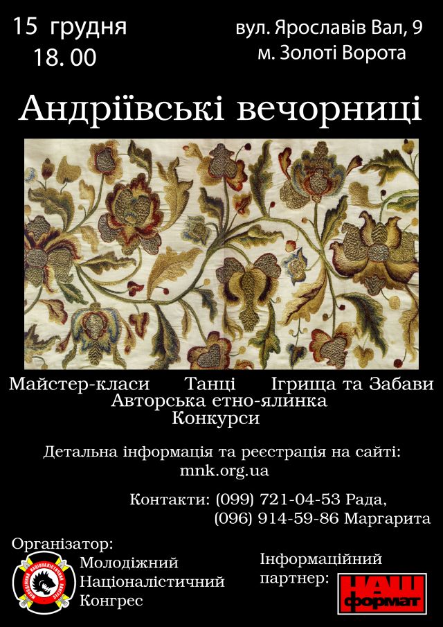 15 грудня Київський осередок Молодіжного Націоналістичного Конгресу запрошує всіх бажаючих на вечірку. Вечорниці проводяться вже декілька років поспіль, але цьогорічна вечірка перевершить усі попередні.
