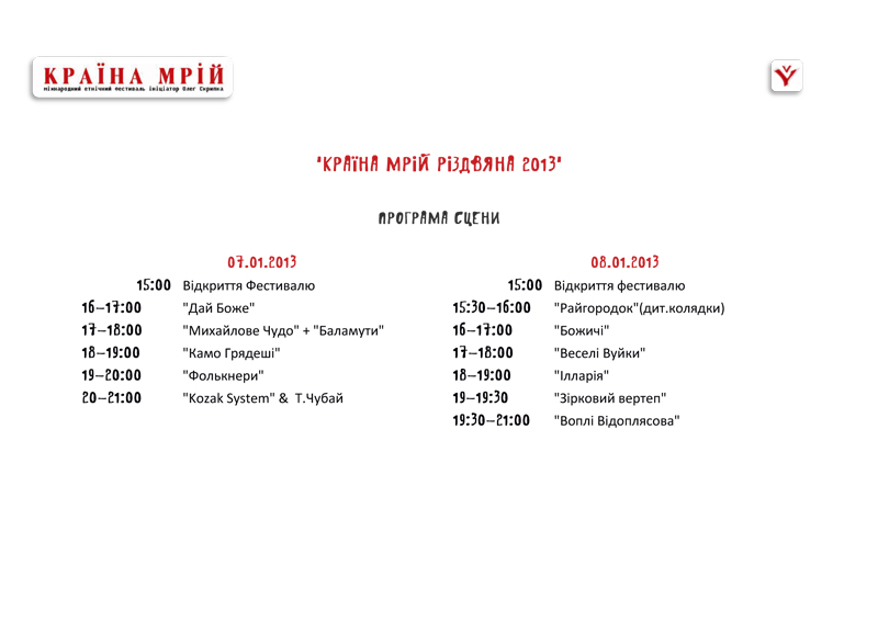 7 та 8 січня 2013 року «Країна Мрій» традиційно запрошує на Різдвяні святкування. Ми пропонуємо долучитися до істинної культури, до справжньої музики й до правдивого та чистого свята.