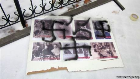 Низка присутніх також долучилася до демонтажу виставки і намалювали фарбою на знесених стендах нацистську свастику.