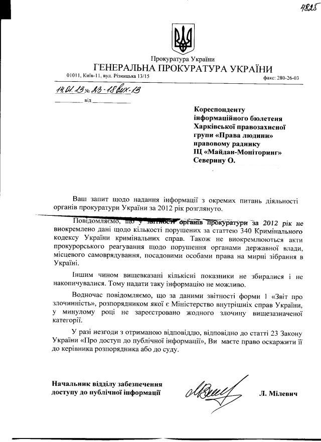 У рамках здійснюваного Інформаційним центром “Майдан-Моніторинг” за підтримки Міжнародного фонду “Відродження” щорічного дослідження стану дотримання в Україні права на мирні зібрання ми спитали у Генеральної прокуратури таке: