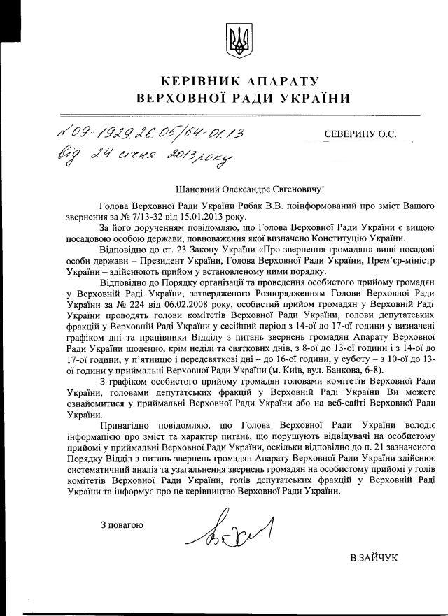 А от – відповідь керівника Апарату Верховної Ради України п.В.Зайчука на звернення до Голови ВРУ п.В.Рибака щодо необхідности встановити порядок прийому ним (п.Рибаком як “вищою посадовою особою”) громадян.