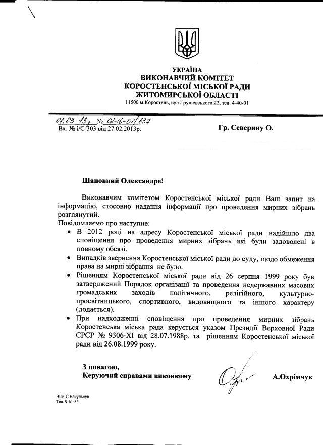 З відповіді міської влади Коростеня (Житомирщина) на запит ІЦ “Майдан Моніторинг” щодо показників, які характеризують стан дотримання права громадян на мирні зібрання, випливає таке: