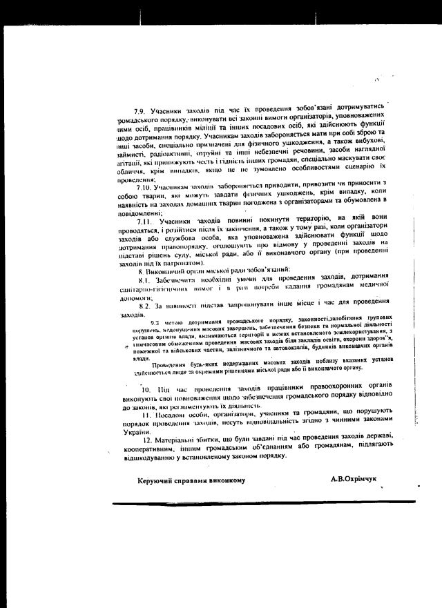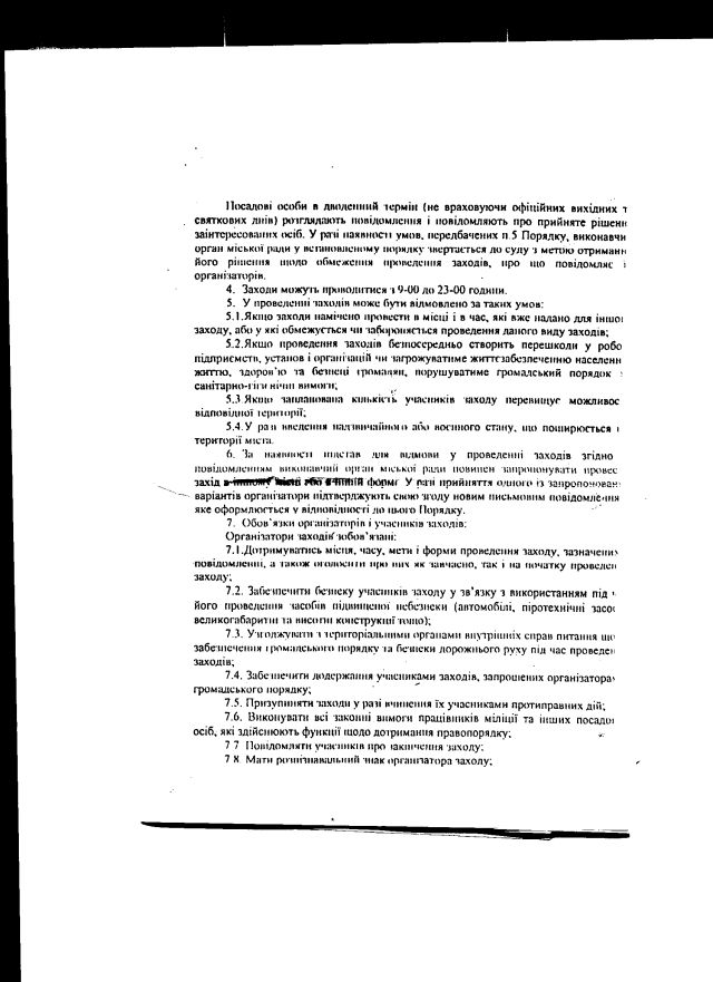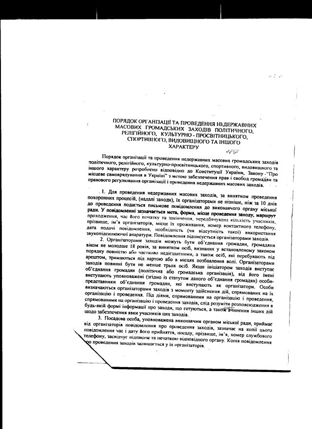 2. Крім того, “самоврядувальники” пішли ще далі і прийняли власний нормативний акт з питань організації і проведення мирних зібрань, при тому, що Конституція і чинні закони України органам місцевого саморядування такого права не надає. Зокрема, як бачите, тим “порядком” також встановлено аж 10-ти денний строк попереднього сповіщення про проведення мирних зібрань.
