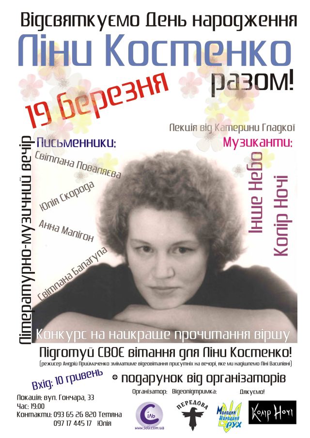 Цікаву розповідь про поетесу готує журналістка та громадська діячка Катерина Гладка. А музичну частину забезпечують київські гурти «Колір Ночі» та «Інше Небо».