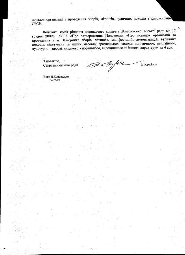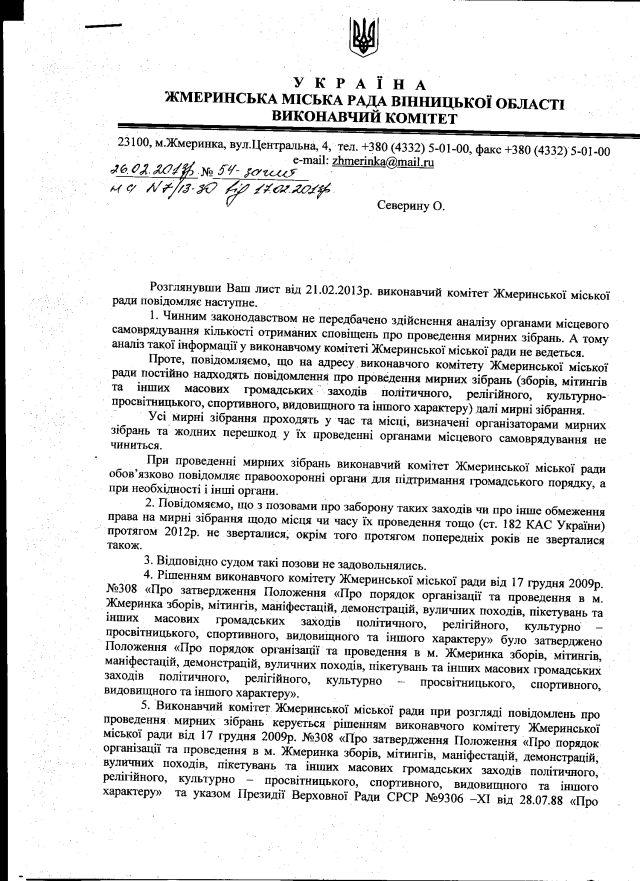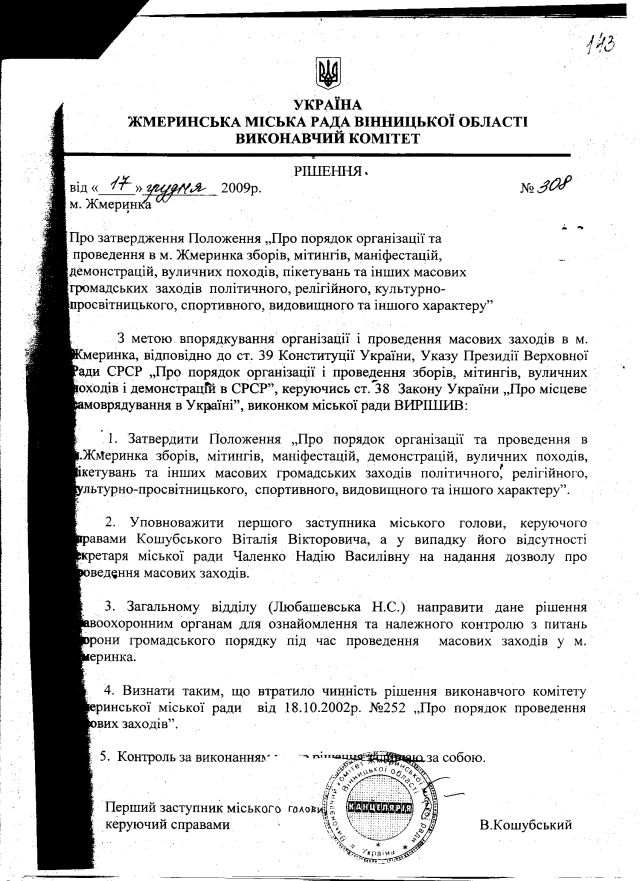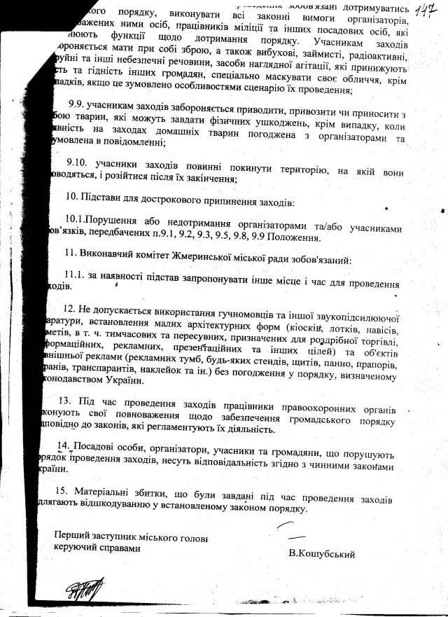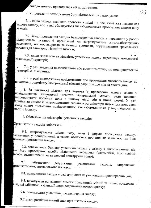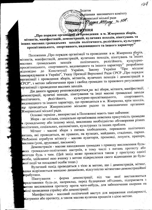 Виявлено чергову перлину “самоврядувальної” творчости: влада славного міста Жмеринки також не лише вважає чинним старий совецький (“старосовецький”) нормативний акт з питань організації і проведення мирних зібрань, але і “підкріпила” його власним нормативним витвором, законних повноважень на те геть не маючи.